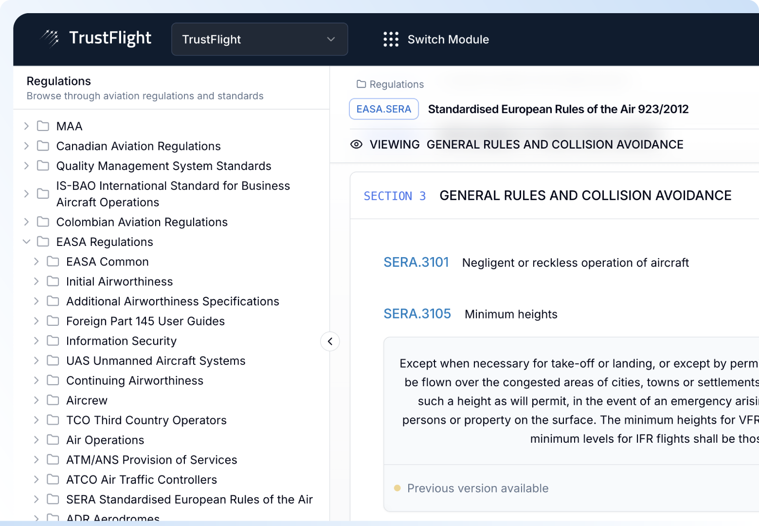 TrustFlight Smart Regulations is AI-powered aviation compliance software that centralizes regulatory documentation and delivers real-time oversight to keep your organization aligned with global requirements.